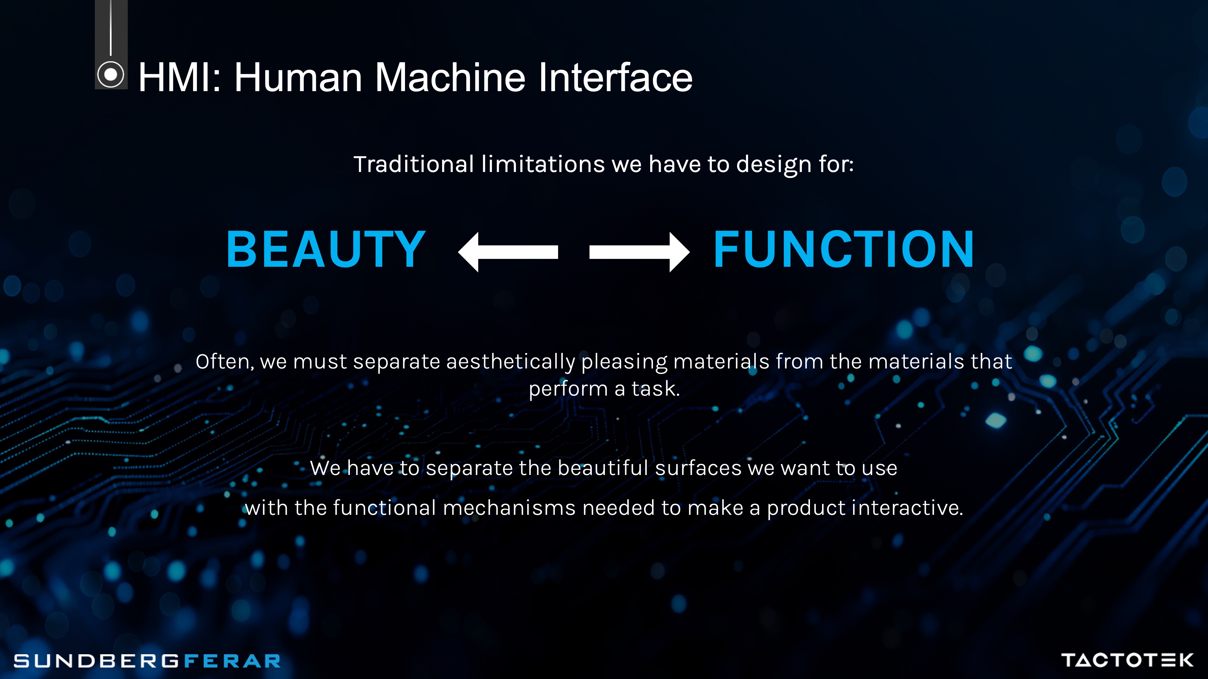 We spoke with David J. Byron, CEO of Sundberg-Ferar, about how smart surfaces can help resolve that tension, how conventional technologies limit design freedom, and why IMSE® technology from TactoTek is opening new possibilities across industries. We also heard engineering perspectives from Derrick Defever, Business Development Manager for North America at TactoTek.